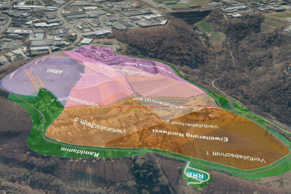 Die Deponieplanung lässt sich am besten in der 3D-Karte visualisieren. Dort können Sie bei gedrückter Strg-Taste die Karte drehen oder neigen. Das 3D-Geländemodell berücksichtigt natürlich noch nicht die zukünftig dort abgelagerten 2,3 Mio. m³ Abfälle.